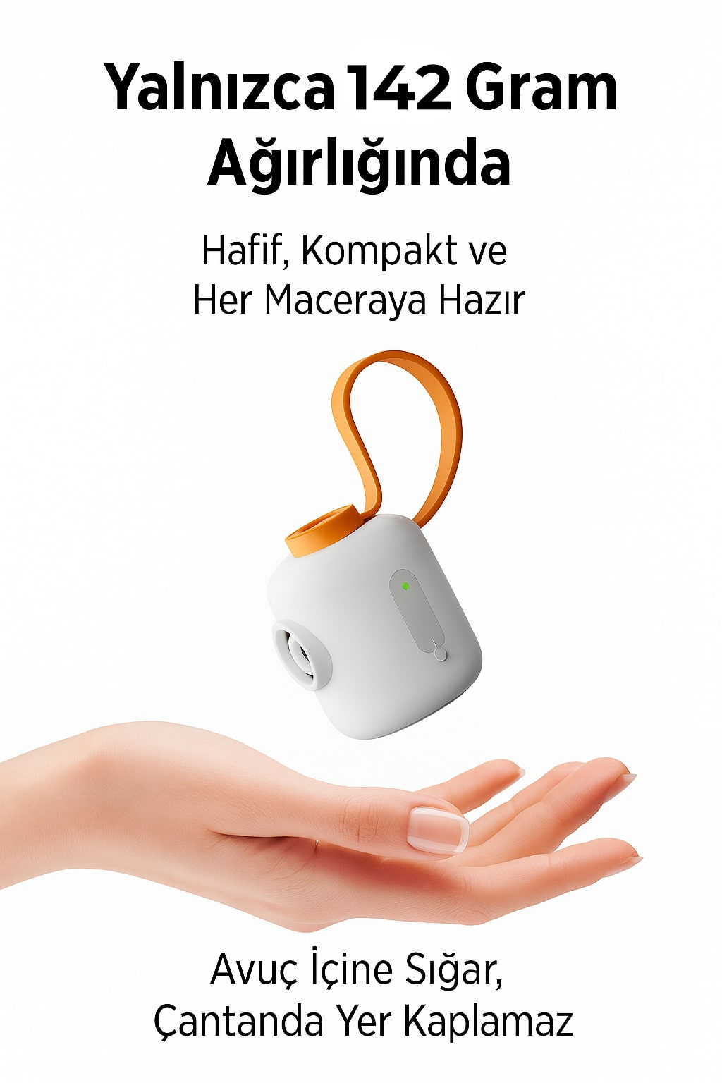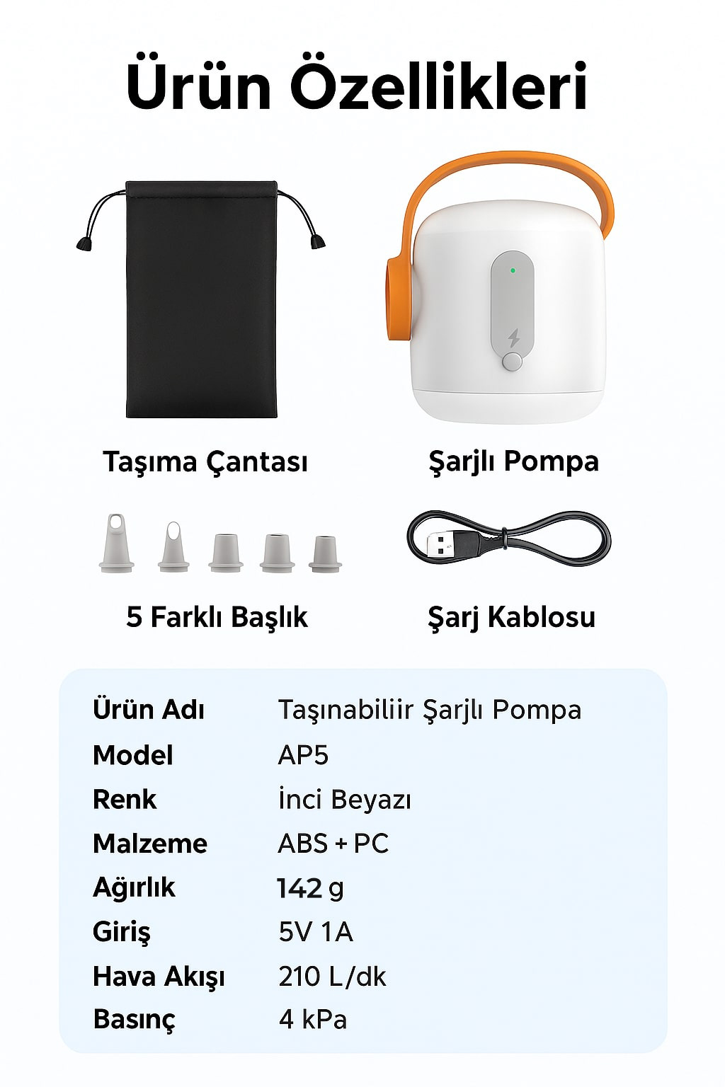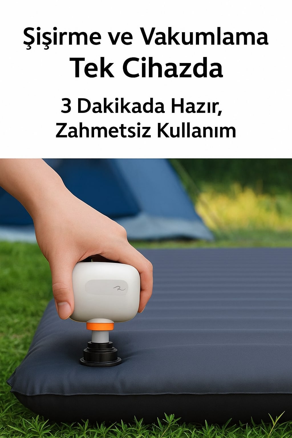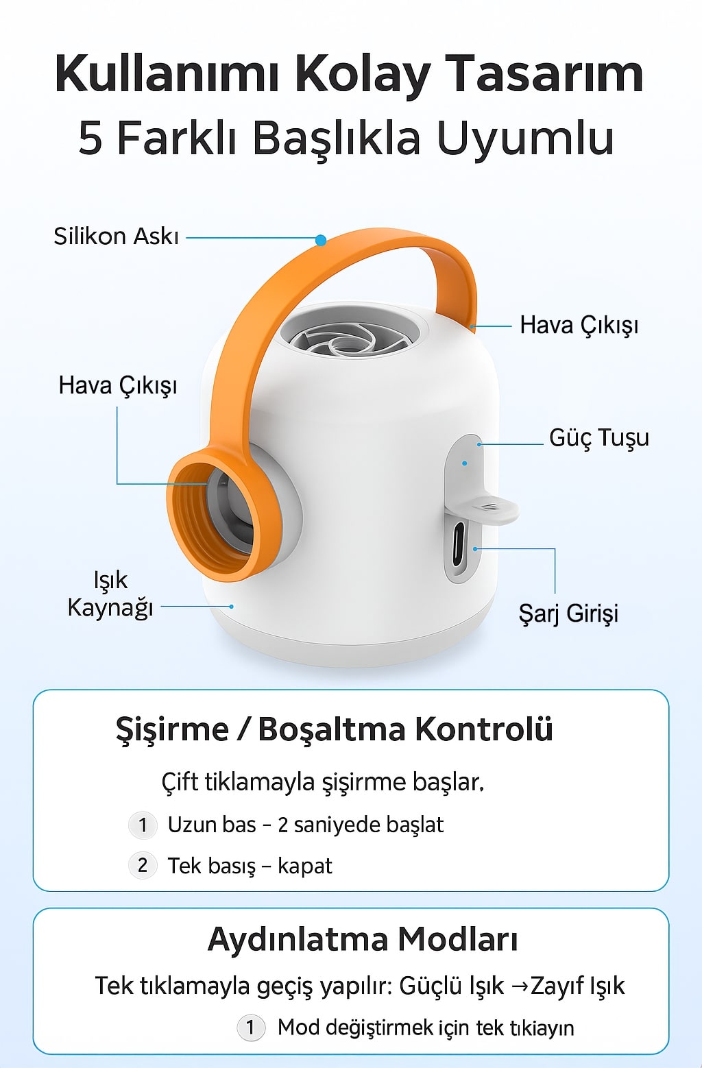 Mini Type-C şarj girişli hafif kolay taşınabilir 3 farklı led moduna ve ayarlanabilir 3 kademeli güce sahip 5 farklı başlıkla bir çok ürünü şişirmede veya isterseniz vakum torbalarınızdaki havayı çekmekte kullanabileceğiniz 4,5 Kpa gücünde dev bir mini pompa.